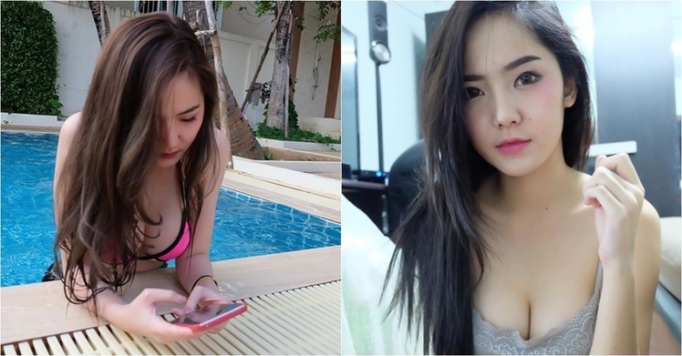 正妹在泳池邊滑手機忍不住就看向超猛美奶球!